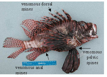 If you or someone you know gets ‘stung’ by the venomous spines, (all the spines are venomous, see figure below) they are advised to immerse wound in hot water for 30 – 90 minutes and seek medical attention as soon as possible. Hook and line or fishing related lionfish catches can be reported to NOAA by emailing to [email protected] or calling (252)728-8714.